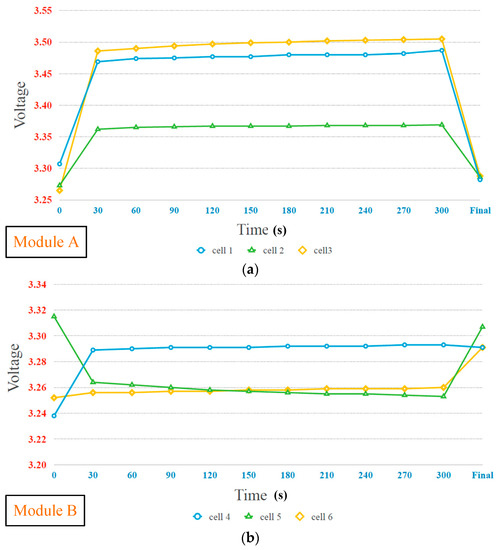 The experimental result of dynamic equalization of the battery pack in the charging process is shown in Figure 21. During the charging process of the battery pack, the voltage difference between Module C and Module D is greatly improved. Since the voltage of the No. 6 battery cell is significantly lower than other batteries, the charging intensity is increased by the proposed equalizer. In addition, the maximum voltage difference of the total battery cells before and after balancing is reduced from 60 to 40 mV, as shown in Figure 21.