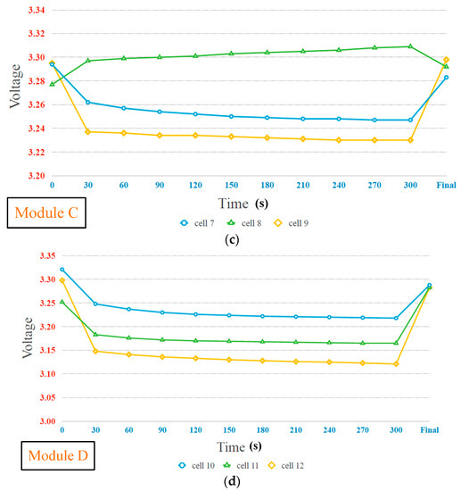 The experiment results of measured voltages in each modules at static equalization process: (a) Module A (b) Module B (c) Module C (d) Module D.