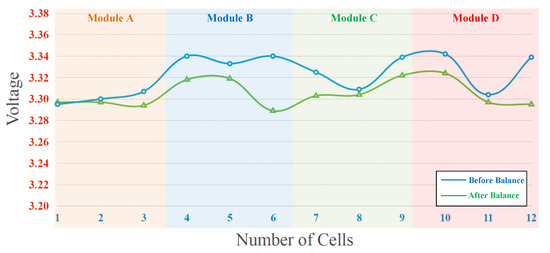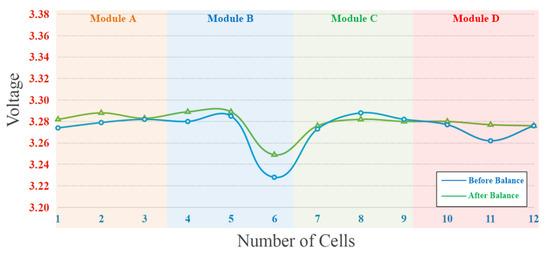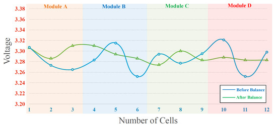 Besides, the experiment result of dynamic equalization of the battery pack in the discharging process is presented in Figure 22. Since the battery cell voltage of module A is the lowest among the four modules, the proposed equalizer activates dynamic equalization to achieve battery voltage balance. In addition, the maximum voltage difference of the total battery cells before and after balancing is reduced from 47 to 35 mV, as shown in Figure 22.