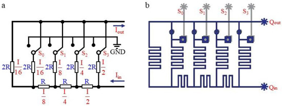 An electrical schematic diagram of the weighted current resistance network is shown in Figure 1a. For the convenience of illustration, only four parallel branches are selected. As a parallel system, regardless of the states that switches S0–S3 are in, the current through each branch is obviously constant. Because the parallel branches have different resistances, the current will be weighted according to the different branches. For example, when the total flow rate of the trunk channel is I, the current of branch S3 is I/2, S2 is I/4, S1 is I/8, and S0 is I/16. These weighted currents will be collected at the outlet end for the addition operation to obtain the total outlet current. Therefore, if the current in a branch is grounded, then the current in that branch cannot be added at the outlet, and the current at the outlet will be reduced. The two position states of switch Sn can be regarded as binary 0 or 1. Due to the different weights of each branch where Sn is located, four switches can form a 4-bit binary number to represent the output flow. This is the basic principle of weighted resistance. The fluid network under this principle is shown in Figure 1b.