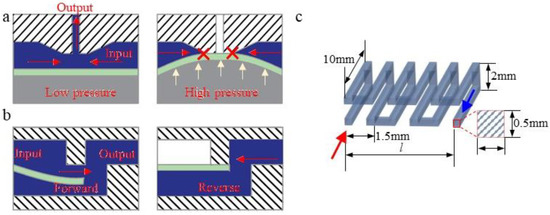 The fluid signal processing function has been one of the most popular research directions for microfluidic devices in recent years. It is also a significant branch of digital microfluidic technology. Compared to being used as an experimental container for biochemical reactions, a microfluidic device with this function can expand the application of microfluidic technology to mechanical and electronic fields. As early as 2015, Au et al. reported the prototype of a microfluidic device with automated control functions [1]. Subsequently, based on summarizing the microfluidic logic control methods in recent years, Sochol et al. reported a microfluidic device with a digital processing function fabricated through a 3D printing method [2] that can process fluid signals itself. Woodhouse et al. demonstrated a microfluidic logic system and applied it to the study of the self-assembly behavior of photochemically active matter [3]. Elatab et al. noted that the next generation of microfluidic devices should be able to perform in situ analysis and processing of complex fluid behavior, similar to the current integrated electronic circuits that use logic gates to perform complex operations. This would enable the microfluidic system to make decisions autonomously according to Boolean rules and eliminate the need for any external intervention [4]. Some emerging fields have urgent needs for this technology. For example, Wehner et al. reported that soft robots have many attributes, many of which will be very complicated when implemented with rigid structures. The soft robot must be bound to the control and power systems of the rigid robot. To realize the potential of soft actuators, new strategies are needed to create completely soft drives, actuators, and robot structures. These key components include flexible mechanical systems and pressure-driven 3D microfluidic chips with logic operations [5]. Pneumatic soft actuators can contact and manipulate soft and fragile objects without damaging them, such as manufacturing assembly line robots, automatic packaging robots, fruit picking robots, and so forth. Furthermore, it can safely interact with human beings, which is suitable for nursing workplaces, such as hospitals and nursing homes. Its continuous working mode is also similar to the working process of bionic motion robot muscles, which has great bionic application potential.
