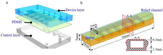 In the entire weighted flow resistance network, we adjust the resistance by changing the axial length l of the flow resistance network, where the length is related to 2R. We arrange these three-dimensional structures according to the network diagram of the desired flow resistance and obtain the structure model of the microfluidic chip shown in Figure 3a (Supplementary Material for detailed structure). For the convenience of manufacturing and maintenance, the chip has a three-layer assembly structure, which is equipped with screws and nuts. The three layers are fixed tightly. Among them, the upper and lower layers are the device and control layer structures, and the middle layer is a PDMS film. A hose can be directly inserted into the interface, sealed and fixed with UV glue.