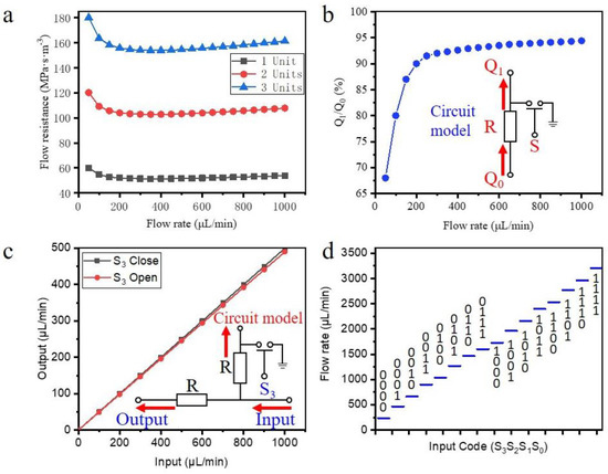 Figure 4c shows the mutual interference curve of the flow rate between different branches. During the simulation process, microvalve S3 is controlled to switch between 0 and 1, and the output flow rate for the flow resistance R in parallel with the S3 branch is tested. The flow through R directly enters the follow-up branch. The calculation results show that the input flow of the subsequent branch changes with the change in the S3 state, but this change is only approximately 2%, so the influence of a single branch microvalve on the remaining branches can be ignored.