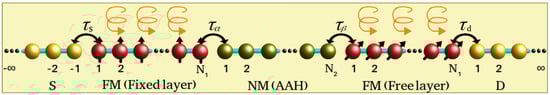 - Núñez, A.S.; Duine, R.A.; Haney, P.; MacDonald, A.H. Theory of spin torques and giant magnetoresistance in antiferromagnetic metals. Phys. Rev. B 2006, 73, 214426. [Google Scholar]