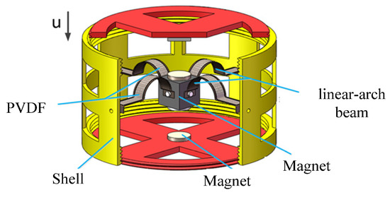 Aiming at the power supply problem of wireless monitoring nodes in coal mines and considering the characteristics of multidirectional and low-frequency excavation excitation, Zhang [30] proposed a new type of multifield coupled multidirectional piezoelectric energy harvester. As shown in Figure 1, the device can adapt to the mining environment and effectively collect vibration energy in different directions. Based on this, this paper designs a linear-arch beam TPEH. Under u-direction excitation conditions, a linear-arch beam TPEH dynamic model is established, and the influence of the horizontal distance, vertical distance and excitation acceleration of the magnet on the dynamic response characteristics is analyzed by means of numerical simulation. An experimental platform was built to verify the correctness of the theoretical analysis, the research provided theoretical guidance for the design of the linear-arch beam TPEH. The structure of this article is arranged as follows: Section 2 provides a schematic diagram of the structure of the TPEH in this study and then introduces the establishment of the nonlinear restoring force model and the magnetic force model, and the dynamic model is obtained. In Section 3, the system potential energy under different magnet distances and the dynamic performance under different magnetic distances and excitation accelerations are analyzed through simulation. In Section 4, experiments were performed to verify the theoretical results. Finally, in Section 5, the main findings and conclusions are presented and summarized.