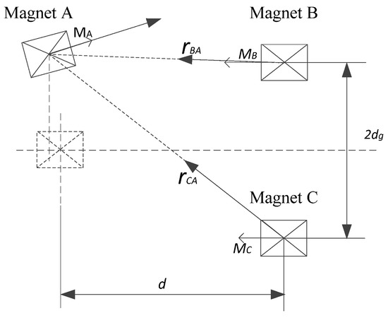 where and are the unit vectors in the x and z axis directions, respectively; and represent the magnetization of magnets A and B, respectively; and and represent the volumes of magnets A and B. Since , we have