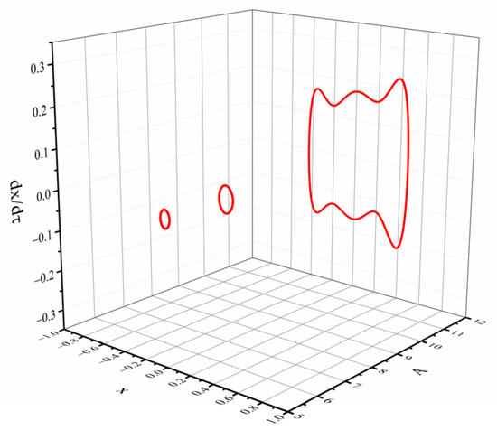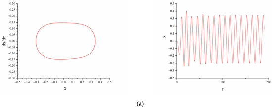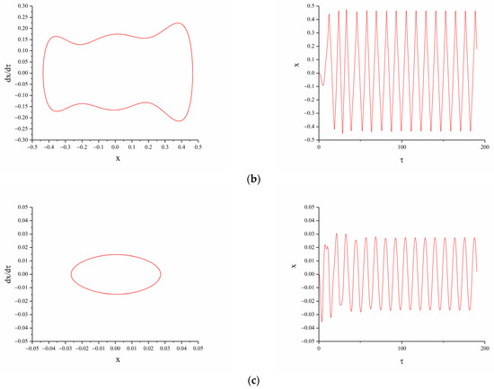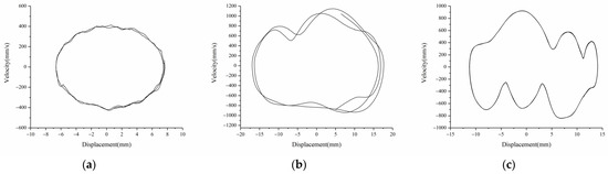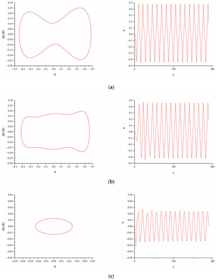 When , , , the excitation acceleration a is changed. Figure 8 shows the displacement-velocity phase diagrams with accelerations of , and .