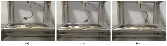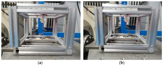 Figure 12 shows the experimental results of displacement-velocity of linear-arched beam under different magnetic distances when and . As shown in Figure 12a, when , the system has only one potential energy well, and the system moves periodically in the well. As shown in Figure 12b, when , the system has two potential wells, and the excitation intensity is sufficient for enabling the system to cross the potential barrier to achieve bi-stable motion. Figure 13 shows the two stable positions of the system. When , as shown in Figure 12c, the system cyclically moves between three stable positions, showing three-stable characteristics, and the displacement amplitude is greatly increased.