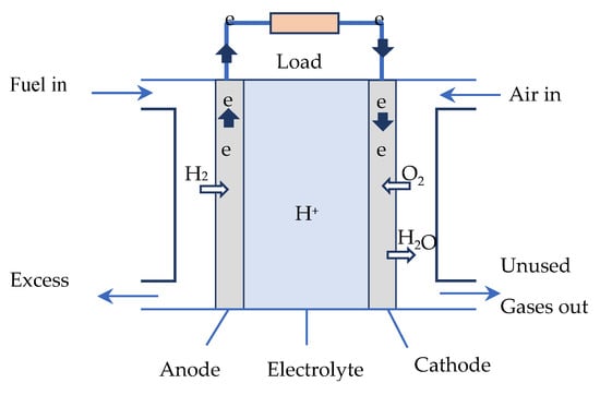 A fuel cell (FC) is an electrochemical energy generator used to directly transform the chemical energy of a fuel (hydrogen, hydrocarbons, alcohols, etc.) into electrical energy. Figure 1 shows a schematic of a hydrogen PEMFC. The FC core consists of three elements, including two electrodes—an oxidizing anode (electron emitter), and a reducing cathode (electron collector)—separated by an electrolyte. The FC is supplied by an injection of hydrogen at the anode and air at the cathode. Continuous electrical energy is then available across the FC.