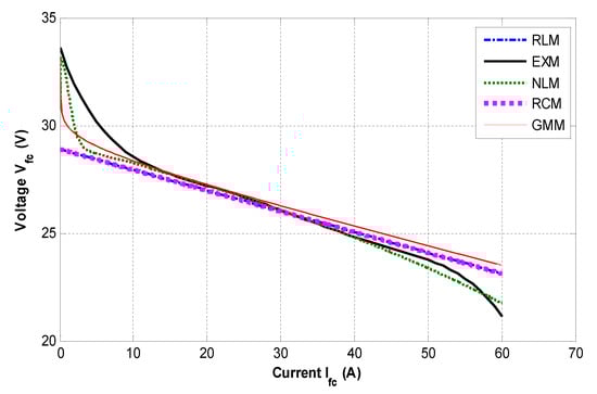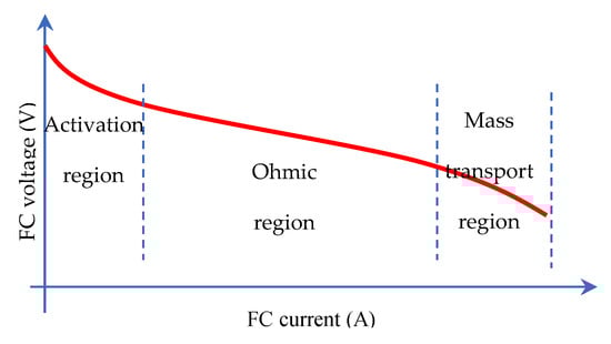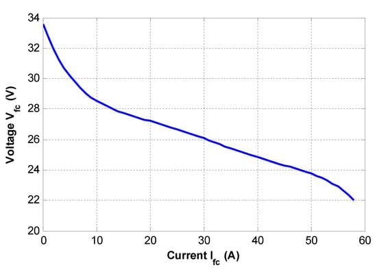 Static models representing the input–output behaviour of the FC—in particular, the nonlinear current–voltage characteristic (see Figure 2). The output voltage of the fuel cell is dependent on the thermodynamically predicted fuel cell voltage output, and three major losses: activation losses (due to the electrochemical reaction), ohmic losses (due to the ionic electronic condition), and concentration losses (due to mass transport).