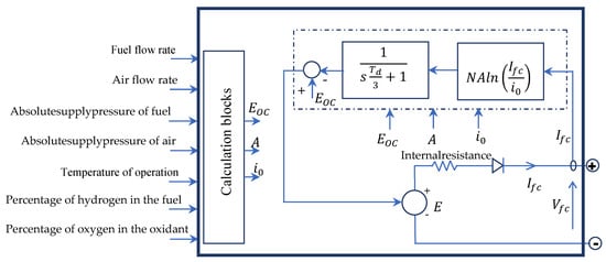 where s is the Laplace operator and is an open circuit voltage (V); N is the number of cells; A is a Tafel slope (V); i0 is the exchange current (A); and Td is the response time (at 95% of the final value) (s). In Equation (10), the parameters (, , ) are updated online based on the input pressures and flow rates, stack temperature, and gas compositions [29].