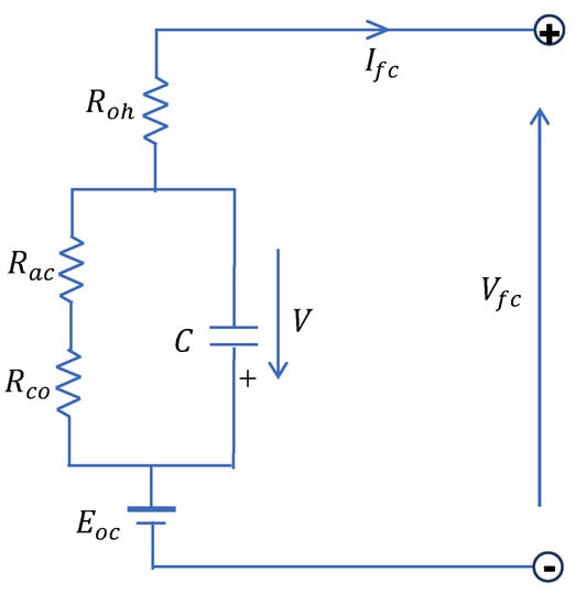 Most dynamic models for PEMFCs are complex, and are not easy to use for control purposes. An equivalent electrical circuit could be used as a good alternative to model the fuel cell’s dynamical behaviour as represented in Figure 4.