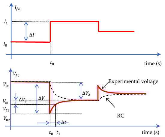 It should be emphasized that the capacitor C in the RC model of Figure 4 affects the transient response of the PEMFC. Using the simulation RC model shown in Figure 4, the shape of the transient response of this model to the step load change is represented in Figure 5. It should be noted that when the load current steps up, the voltage drops simultaneously to some value due to the ohmic losses, and then it decays exponentially to its steady-state value due to the capacitor C. However, the experimental voltage of the PEMFC, as can be seen later (Section 5) and found in many works [12,31,32] has the form of Figure 5. This figure clearly illustrates a big difference between the experimental fuel cell voltage and the corresponding voltage given by the RC model. We conclude that the equivalent electrical RC circuit is not suitable for a PEM fuel cell. In the next section, we will present a new equivalent electrical model using an inductor instead of a capacitor, and we will show that the transient of the obtained model fits the experimental transient.