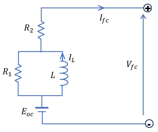 As shown in the previous section, the equivalent electrical RC model is not appropriate for modelling the dynamics of a fuel cell, since its transient is different compared to the experimental data. In this paper, a new equivalent electrical circuit is proposed using an inductor and resistors, as shown in Figure 6. Note that the open-circuit voltage remains the same as in Equation (14).