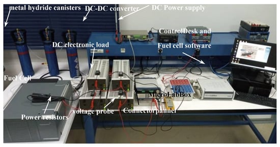 In this section, we will determine the static and the dynamic behaviour of the Ballard Nexa 1200 fuel cell module, which has a rated power of 1.2 kW. To this end, an experimental bench was built, as shown in Figure 7; it consists—in addition to the fuel cell, with its monitoring software—of three metal hydride canisters from Heliocentris with storage capacities of 800 NL hydrogen, an H2 connection Kit 15 bar for connecting the metal canisters, a Nexa 1200 DC/DC converter, a power supply from BK Precision used for the fuel cell starter, Hall effect sensors to measure the voltage and current variables, a programmable DC electronic load from BK Precision and power resistors to make load changes, and a MicroLabBox-dSPACE with Control Desk software plugged into a personal computer for signal acquisition.