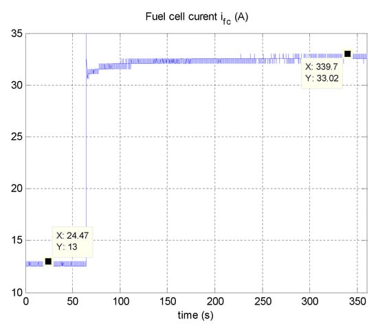 For we suppose that which corresponds to a constant fuel cell voltage (see Figure 5). At the instant , we apply a current step change from to , and then the inductor current will evolve, using Equation (21), according to the following equation:
