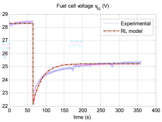 Using the procedure shown in Section 2.4, which describes the method for determining the parameters of the equivalent electric model RL, and using the experimental responses shown in Figure 8 and Figure 9, we obtained the results listed in Table 2. Figure 10 shows a comparison between the experimental voltage of the fuel cell and that obtained from the RL model. One can show a good fit for the proposed RL model.
