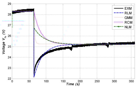 In this section, a comparison between the dynamic behaviour of four models and the experimental results in the presence of fuel cell current changes was studied. Figure 13 illustrates the dynamic behaviour of each model. As is clearly shown, the proposed RL equivalent electrical model presents the best dynamic behaviour compared to the conventional RC model used in the literature. The main advantages of this model lie in its simplicity and stability to produce the same behaviour as the fuel cell.