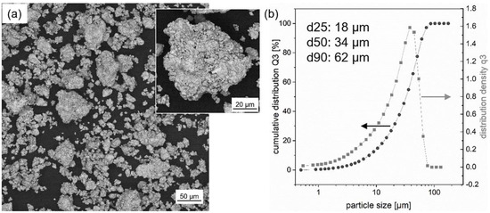 Figure 1. Fe73.8-Pr20.5-Cu2.0-B3.7 powder: (a) Powder used in the L-PBF process (scanning electron microscopy image, backscatter electron detector). A higher magnification image of the powder is shown as inset of (a). (b) Particle size distribution (cumulative distribution Q3, distribution density q3) of the powder using laser diffraction. The values of d25, d50 and d90 are also listed.
