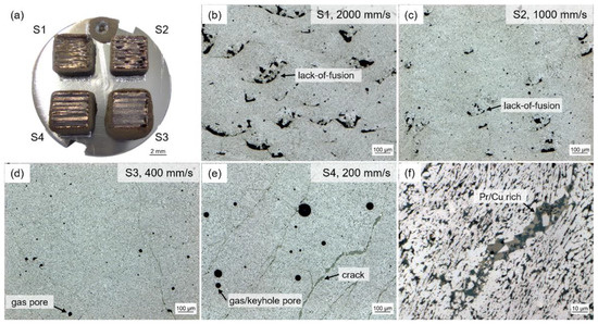 For the selection of suitable processing parameters, four different laser scanning speeds—2000 mm/s, 1000 mm/s, 400 mm/s and 200 mm/s—were chosen. They are related to volume energy densities (VED) of 21.7 J/mm3, 43.5 J/mm3, 108.7 J/mm3 and 217.4 J/mm3, respectively. This covers a large possible process window typically used for either realizing fine, textured or both structures [4,27]. Figure 2 shows the printed parts (Figure 2a) and corresponding microstructures (Figure 2b–e). A relief of the scan tracks is visible on the surfaces of the printed parts. With increasing VED an increasing amount of loosely sintered powder adheres to the lateral faces of the printed parts. For 400 mm/s (Figure 2d) the number of defects is smallest and the relative density is highest (97%). For larger laser scanning speeds, the porosity increases significantly (Figure 2b,c) due to lack of fusion. This indicates an insufficient energy input to fully melt the powder. For smaller laser scanning speeds, pronounced cracks and gas pores or keyhole pores occur due to excessive energy input (Figure 2e). The latter printed part shows the smoothest sample surface, but also the largest amount of adhering powder particles. This indicates a strong heat effect on the surrounding powder from the high energy input. It has to be noted that cracks formed at an elevated temperature are filled directly with the liquid phase, i.e., Pr/Cu rich eutectic (Figure 2f). Regarding the microstructure and density of the printed parts, a laser scanning speed of 400 mm/s (VED of 108.7 J/mm3) offers the best starting point for further parameter optimizations. Therefore, this parameter set was selected for further in-depth investigations in this work.