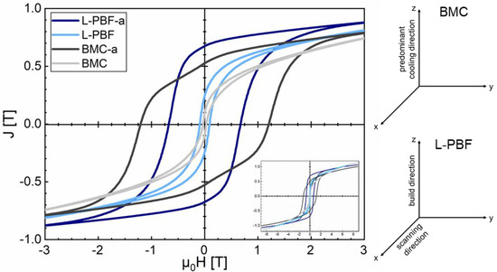 Table 2. Overview of the magnetic properties coercivity µ0HC, remanence Jr and maximum energy density (BH)max of BMC-a and L-PBF-a measured in three axes. Additionally, the magnetic properties of the as-built/as-cast state are listed.