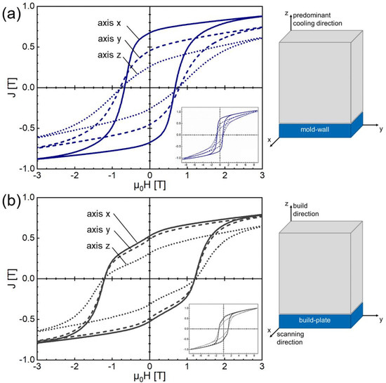 Comparing the annealed BMC material (BMC-a) with annealed additively manufactured components (L-PBF-a) the coercivity (remanence) for L-PBF-a is 45% (26%) smaller (larger) than for BMC-a. From the investigations above it can be concluded that the printed magnets (L-PBF magnet) are characterized by a distinct, predominantly directional microstructure. It originates from the high temperature gradients during the AM process. In contrast, the annealed book-mold-cast FePrCuB sample shows planar isotropic magnetic behavior. The observation of this characteristic is consistent with data previously reported in literature [16,17,25]. Figure 8 shows a schematic representation of the FePrCuB samples and their orientation to the mold wall (BMC) and build plate (L-PBF), respectively. For BMC, the axis perpendicular to the mold wall has the highest cooling rate (z axis). The y axis and x axis are assumed to have similar temperature gradients and are thus interchangeable. In the case of L-PBF, the axis in the build direction has the highest cooling rate (z axis). The axis perpendicular to the scanning direction has an intermediate temperature gradient (y axis) whereas the axis along the scanning direction has the smallest temperature gradient (x axis). In Section 3 it is shown that the different cooling rates influence orientation of the c axis of the hard magnetic Fe14Pr2B grains and thus magnetic texturing.