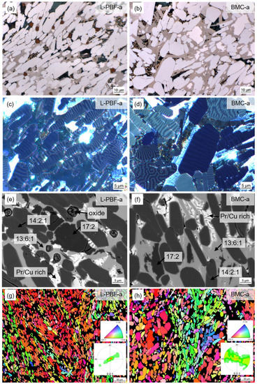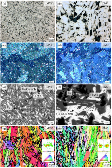 In Figure 5 the microstructure of additively manufactured FePrCuB in the as-built state is shown (L-PBF) in comparison with BMC material as a reference (BMC). The samples were investigated using optical microscopy in bright field (Figure 5a,b) and Kerr mode (Figure 5c,d) as well as scanning electron microscopy in backscattered electron mode coupled with EDX (Figure 5e,f) and EBSD mode (Figure 5g,h). It is obvious from Figure 5a–f that L-PBF of FePrCuB powders results in much finer primary Fe14Pr2B crystals compared to BMC material. The as-printed structure resembles the fine microstructure with a finely dispersed Nd-rich phase observed in additively manufactured ternary Fe75-Nd18-B7 [28]. The phases occurring in both FePrCuB sample types were deduced from the chemical composition determined by EDX analysis. Based on the measured compositions, the following phases are identified: Fe14Pr2B, Fe as well as Pr-rich and PrCu-rich (Table 3).