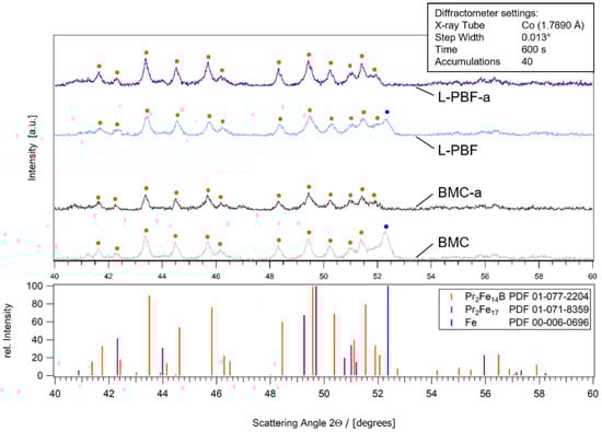 The XRD diffractograms of samples L-PBF/BMC and L-PBF-a/BMC-a show very good agreement with respect to position and intensity of the measured peaks (Figure 7). This indicates that additively manufactured and conventionally cast FePrCuB contain similar phases of comparable composition in both the as-built/as-cast and annealed states. In all samples, the hard magnetic ϕ phase (14:2:1) was identified as the main phase in the diffractogram. In the as-cast (BMC) and as-built (L-PBF) sample, α-Fe was additionally identified. XRD analysis confirms that additive manufacturing results in similar structures as observed in conventional BMC material.