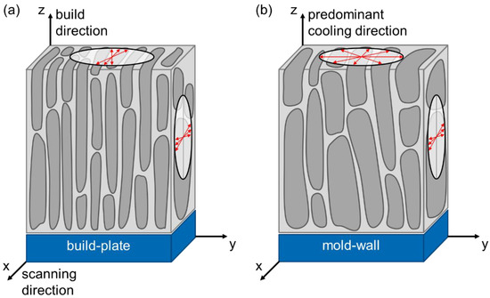 Figure 8. Schematic presentation of the FePrCuB sample orientation and allocation of the axes in the samples (a) L-PBF-a and (b) BMC-a. In both cases, the z axis is assigned to the direction with the highest temperature gradient during solidification. Based on results from Section 3, typical orientations of c axes of Fe14Pr2B grains are qualitatively indicated by red arrows.