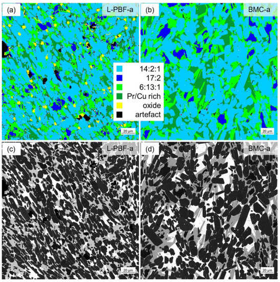 Figure 9. Quantitative image analysis for L-PBF-a in comparison with BCM-a: (a) Quantitative image analysis L-PBF-a (false color representation). (b) Quantitative image analysis BMC-a (false color representation). (c) SEM image used for quantitative image analysis L-PBF-a. (d) SEM image used for quantitative image analysis BMC-a. Both contain similar volume fractions of the 14:2:1 phase, Pr-rich phase and 17:2 phase. BMC-a contains slightly larger amounts of the 13:6:1 phase. L-PBF-a contains an additional 3% RE oxides.