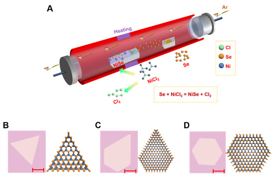 The growth of NiSe flakes with a chemical vapor deposition (CVD) method. (A) Schematic of the CVD setup for NiSe synthesis. The precursors are NiCl2 and Se powers. (B) The optical image and corresponding atomic structure image of triangle-like NiSe flake. (C) The optical image and corresponding atomic structure image of pentagon-like NiSe flake. (D) The optical image and corresponding atomic structure image of hexagon-like NiSe flake. The scale bar is 10 um.