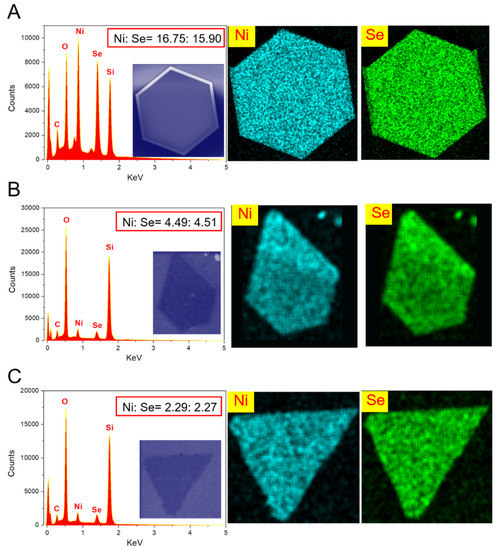 The energy-dispersive X-ray spectroscopy (EDX) characterization and mapping images of as-grown NiSe flakes. (A) The EDX curve and corresponding mapping images of hexagon-like NiSe flake. (B) The EDX curve and corresponding mapping images of pentagon-like NiSe flake. (C) The EDX curve and corresponding mapping images of triangle-like NiSe flake. Insets show the SEM images.