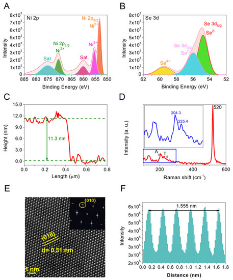 Common characterization tools are used to further study the properties of as-grown samples. The EDX and SEM technologies are used to characterize the chemical composition and uniformity. As shown in Figure 2, The EDX spectra of as-grown samples with triangle shape (Figure 2A), pentagon shape (Figure 2B), and hexagon shape (Figure 2C) show the atoms ratios of Ni: Se is nearly 1:1, which proves the grown materials are NiSe flakes. The Ni/Se ratio is controlled by the growth temperature. The same atomic ratios of the as-grown materials indicate that the grown materials are the same, which proves the stability of the experimental conditions and the compositional homogeneity. The corresponding mapping images indicate that the grown NiSe flakes are uniformity and NiSe with hexagon shape is of better quality. XPS technology is further used to study the elemental composition and valence states of the grown sample. Figure 3A,B show the XPS spectra of high-resolution Ni 2p and Se 3d, respectively. The two peaks located at 870.5 and 853.2 eV in Figure 3A are is attributed to Ni 2p1/2 and Ni 2p3/2, respectively, which is corresponding to Ni2+. The satellite peaks (Sat.) located at 860.1 and 875.1 eV derived from nickel oxide as the surface exposed to air and oxidized. The peak at 855.4 eV is consistent with Ni3+ [36]. The overlapping peaks located at 55.9 and 54.8 eV in Figure 3B are assigned to Se 3d3/2 and Se 3d5/2, respectively, corresponding to Se2−. The XPS results further confirm that NiSe flakes have been successfully synthesized. To study the thicknesses of as-grown NiSe flakes, the representative AFM technology is employed. As shown in Figure 3C, the thickness of the thin flake NiSe in this experiment is 11.3 nm. The corresponding optical image and recognition image are shown in Figure S1d. The recognition image indicates the smooth surface morphologies of the prepared NiSe. The characterized Raman spectra of as-prepared NiSe samples with a laser excitation wavelength of 532 nm are shown in Figure 3D. The prominent peak locating at 520 cm−1 is consistent with the Si peak. The Raman peak occurring around 204.4 and 225.4 cm−1 correspond to the Ag and Tg mode, respectively, which are in line with the stretching and librational modes or their combination of Se–Se pairs. The Raman peaks are different from that of NiSe2. There are no obvious peaks that occur in 141 and 235 cm−1, indicating the amorphous Se element is not synthesized. The absence of the peak around 506 cm−1 indicates that there are almost no defects and surface effects on the surface of the prepared NiSe sample [37]. The Raman spectra demonstrate high-quality NiSe samples have been successfully synthesized. TEM technology is further employed to characterize the quality and lattice structures of as-synthesized NiSe flakes. The TEM samples are prepared by transferring the grown NiSe flakes onto a copper grid with an isopropanol-assisted method. As shown in Figure 3E, the STEM image indicates a clear hexagonal symmetry structure and high quality of the prepared NiSe sample. The one set of diffraction spots with 6-fold symmetry shown in the selected area electron diffraction (SAED) image on the top right of STEM pattern demonstrates the single-crystal property of NiSe flakes with high quality and good crystallinity. As shown in Figure 3F, the interplanar distance of the NiSe sample measured in Figure 3E is about 0.31 nm, which is consistent with the 010 planes. All characterization results exhibit the thin NiSe flakes with high quality, good crystallinity, and uniform surface are successfully synthesized.
