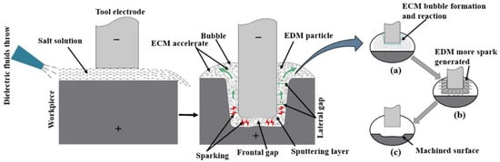 ECDM is a combined process of EDM and ECM, in which electrochemical dissolution and electrical discharge erosion occur simultaneously in ECDM in the lateral machining gap and frontal gap, respectively. The mechanism of ECDM is depicted in Figure 1. In this hybrid machining, sodium nitrate (NaNO3) has been used. NaNO3 is used for machining stainless steel when close replication of the tool is of utmost importance, as it prevents stray corrosion, ensuring precise tool replication. Lower concentration electrolytes are used to improve the machining resolution. The resolution is improved due to the increased electrolyte resistance, which requires shorter current paths for a given pulse length.