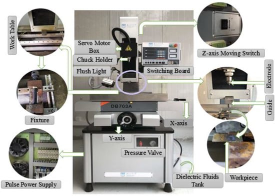 A machine tool has been shown in Figure 2, which includes an XYZ motion table, a working fluid recycling system, tool electrode clamp, high-pressure flushing unit, a power supply cell, voltage and current measuring unit, a pressure pump with pressure regulating valve, and a self-designed fixture. Tool electrode can be fixed into the machine head and can be carried in the feed rate guidance via a servomotor in the direction perpendicular to the XY plane. A motor is mounted on the Z-axis and rotates the tool electrodes. The control box contains the pulse generator, which provides the pulse voltage and the process control system. Due to the salt solution, all of the equipment’s exterior enclosures, especially the parts in contact with the solution, are constructed with a stainless steel portion.
