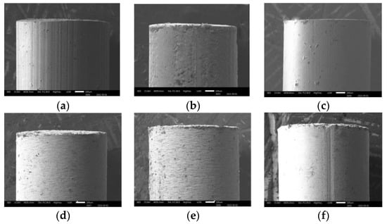 All experiments were carried out on stainless steel (SS304) workpiece with the size of 43 mm (length) × 15 mm (width) × 2 mm (thickness), and all cylindrical electrodes were 1.0 mm in diameter and 200 mm in length. Figure 3 represents the six different tool electrodes before machining. SS304 has a high initial melting temperature, heat corrosion resistance, and strong properties, such as creep resistance and fatigue resistance (Figure 3a). The TC4 has excellent corrosion resistance, and can withstand high temperature (Figure 3b). Brass is copper alloyed with high Zinc content, which is most widely regarded for non-traditional machining with various electrodes (Figure 3c). Compared with copper and other traditional electrode materials, CuW alloy has a maximum melting point, and is a relatively cost-effective and efficient choice as electrode material (Figure 3d–f). As shown in Figure 4, EDX analysis of six types of electrodes was performed to investigate the accurate mass percentage of element contents before ECDM. Moreover, from the EDX spectrum, how much the other particle added to the tip part of the electrode after machining was confirmed. Electrode materials’ properties have been given in Table 1.