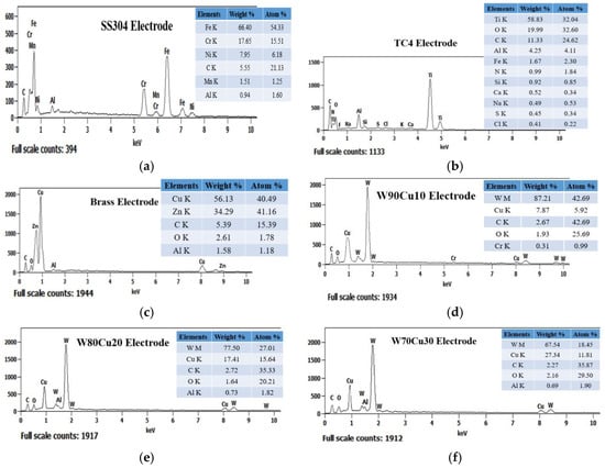 Energy-dispersive X-ray spectroscopy (EDX) spectrum analysis of six electrodes before ECDM: (a) SS304; (b) TC4; (c) brass; (d) W90Cu10; (e) W80Cu20; (f) W70Cu30.