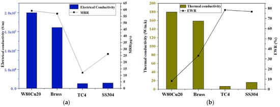 Influence of electrical conductivity and thermal conductivity of different electrodes under machining conditions Ton = 12 μs, Toff = 12 μs, Ip = 14.17 A; (a) MRR and (b) EWR.