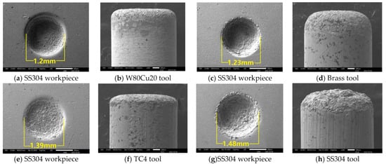 In the ECDM process, the overcut is an essential factor that affects geometrical accuracy. By comparing the overcut caused by the four electrodes, it can be seen in Figure 6 that the SS304, TC4, and brass electrodes have created relatively larger overcuts (0.240, 0.195, 0.115 mm), whereas the W80Cu20 electrode produces a lower overcut (0.100 mm). Figure 7c,e,g show that the brass, TC4, and SS304 electrodes have made large diameters of 1.23, 1.39, and 1.48 mm, respectively, whereas the W80Cu20 (Figure 7a) electrode has created a 1.20 mm diameter on the workpiece. For W80Cu20, the heat from the electrochemical discharges is quickly removed from the machining zone, but for the other three electrodes, the electrochemical discharges are slowly removed. As a result, electrode and hole wall side sparking of the workpiece occurs more often for the SS304, TC4 and brass electrodes than the W80Cu20 (Figure 7a) electrode. The hole wall surface roughness, side gap spark, and electrode erosion are higher for brass, TC4 and SS304 electrode as shown in Figure 7c,e,g. The thermal conductivity of the SS304, TC4, and brass electrode materials are low, as well as the number of the drifting electrons, resulting in a lower discharging in the tip than in the W80Cu20 electrode. The corner of the electrode end has the highest current density and suffers the maximum wear. From the observations in Figure 7d,f,h, the brass, TC4, and SS304 electrodes’ tip part eroded with more roughness than that of the W80Cu20 (Figure 7b) electrode. W80Cu20 has the largest thermal conductivity and its melting point is higher than the other three electrodes.