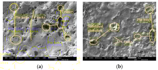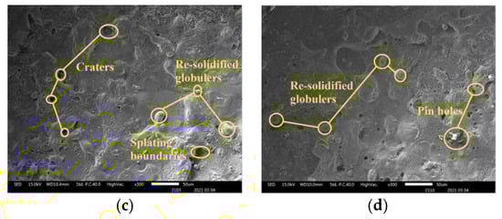In Figure 8, SEM images are used to study the surface topography of the machined SS304 alloy. The electrode material properties have an impact on the surface roughness. If the electrode material’s electrical conductivity is higher, it allows for effective discharges while lowering ineffective pulses, resulting in an improved workpiece surface quality. The electrodes with the most cracks and pinholes on the machined surface are SS304 (Figure 8a) and TC4 (Figure 8b), followed by brass and W80Cu20 electrodes. The hydrodynamic regime is vigorously non-desirable. On the one hand, it increases the drilling time, and on the other hand, it is responsible for lowering the micro-aperture quality, as structural damage (micro-cracks and pinholes) of the drilled micro-apertures transpires in this regime. This phenomenon is caused by the formation of distinct thermally impaired areas. The erosion of the TC4 and SS304 electrodes is high with a lower MRR because the discharging effect is very weak with higher surface defects. However, machining with brass (Figure 8c) and W80Cu20 (Figure 8d) electrodes creates fewer craters and a smaller pinhole. The W80Cu20 electrode has a better surface than the other three electrodes. The W80Cu20 electrode provides the best surface with the least amount of erosion and the highest MRR.