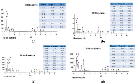 EDX spectrum analysis of four electrodes after ECDM: (a) SS304; (b) TC4; (c) brass; (d) W80Cu20.