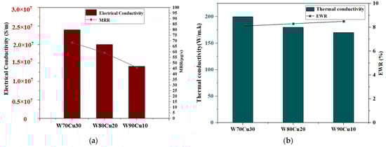 Influence of electrical conductivity and thermal conductivity under machining conditions Ton = 12 μs, Toff = 12 μs, Ip = 14.17 A; (a) MRR and (b) EWR for W70Cu30, W80Cu20, and W90Cu10 electrodes.