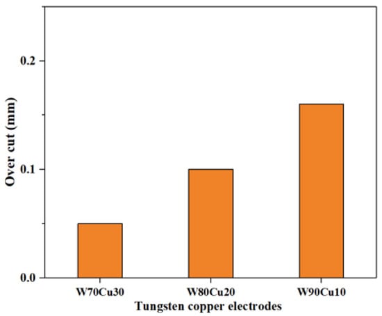 Tungsten–copper tool electrodes’ effect on side overcut under machining conditions Ton = 12 μs, Toff = 12 μs, Ip = 14.17 A.