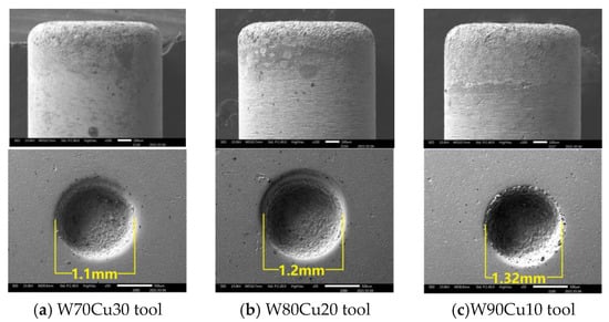 Concerning the geometrical characteristics of holes, the manufacturing process is more accurate when the CuW electrode is used for the overcut (Figure 11), and diameters are lower (Figure 12). From the SEM images (Figure 12) of three CuW electrodes and the machining workpiece hole, the W70Cu30 electrode machining hole diameter (Figure 12a) is 1.1mm, which is lower than the other two holes’ diameter, i.e., 1.2 and 1.32 mm (Figure 12b,c), respectively. This occurs on the machining instant, because the edge sparking for W80Cu20 and W90Cu10 appeared more than W70Cu30. The machining time for W80Cu20 and W90Cu10 is also more than W70Cu30. It can be seen from the SEM images of the three-electrode tip and upper body part that the W90Cu10 and W80Cu20 electrodes’ surfaces are rougher than that of W70Cu30. Due to large diameter holes processing by W90Cu10 and W80Cu20, the overcut is also higher for these two electrodes (0.1 and 0.16 mm) than W70Cu30 (0.05 mm), as shown in Figure 11. A high thermal diffusivity means that heat moves rapidly through the electrode without damaging it. A lower thermal diffusivity of W80Cu90 and W80Cu20 results in the two electrodes’ side sparking between the hole wall and electrode happening more frequently than the tip part, when compared to W70Cu30. Hence, the OC is lower for W70Cu30 than the other two electrodes. When concerning machining complex geometrical materials, choosing suitable electrodes is extremely important. The main reason is that, due to the higher conductivity of W70Cu30, the corner end of the electrode is not more eroded.