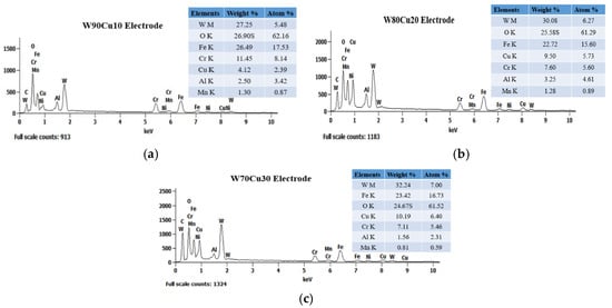 EDX spectrum and material deposition analysis of three electrodes after ECDM process: (a) W90Cu10; (b) W80Cu20; (c) W70Cu30.