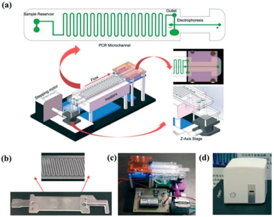 - Li, Z.; Ju, R.; Sekine, S.; Zhang, D.; Zhuang, S.; Yamaguchi, Y. All-in-one microfluidic device for on-site diagnosis of pathogens based on an integrated continuous flow PCR and electrophoresis biochip. Lab Chip 2019, 19, 2663–2668. [Google Scholar] [CrossRef]