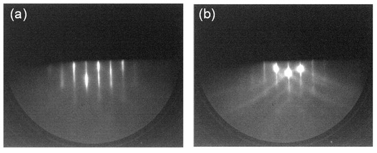 Figure 2. [ 1 1 ¯ 0 ] azimuth RHEED patterns from (a) a GaAs (110) substrate after desorption of a native oxide, (b) a GaAs (110) cap layer on the MQW structure with Tg = 580 °C. Both patterns indicate (1 × 1) non-reconstructed surface.