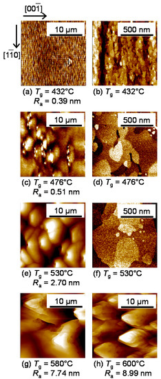 Figure 3. Atomic force microscopy (AFM) images with a scan size of 20 × 20 µm2 in (a,c,e,g,h), and of 1 × 1 µm2 in (b,d,f), for the surface of the samples grown at given Tg. The value of the average surface roughness (Ra) of each sample is also shown in the figures. Crystal orientation is indicated by the arrows in (a).