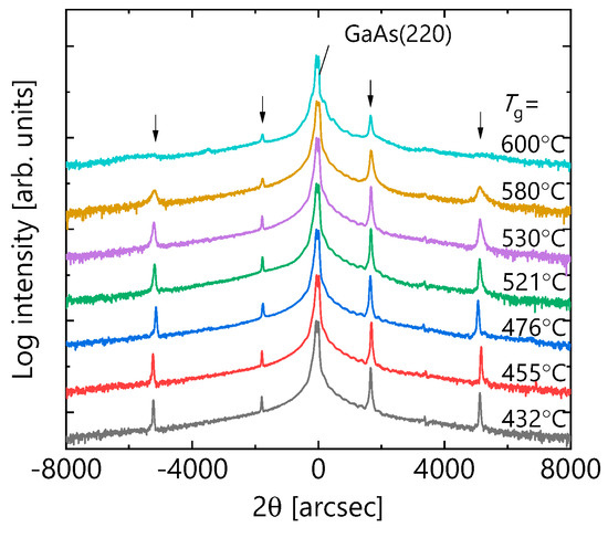 Figure 4. X-ray diffraction (XRD) profiles of θ-2θ scan at the (220) diffraction for the samples with given Tg. The x-axis is the angle relative to the diffraction angle of GaAs. The satellite peaks derived from the periodic structure of multiple quantum wells (MQWs) are indicated by the arrows.
