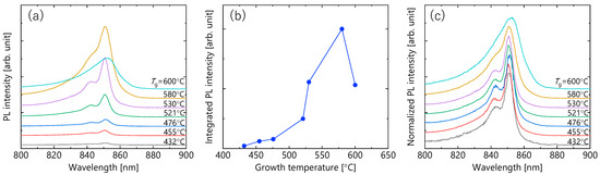 We next explain the results of the CW-PL measurements at RT. Figure 5a shows Tg dependence in the PL spectra. For all the samples, the PL peaks appeared at the same wavelength. Since the PL wavelength reflects the quantum confinement of carriers, Figure 5a indicates that the quantum structures with the same average well width are formed with different Tg. This seems to be consistent with the XRD analysis showing satellite peaks at the same angle, as shown in Figure 4. The integrated PL intensity of each sample is summarized in Figure 5b. The integrated PL intensity had a peak behavior. When Tg was raised from 432 to 580 °C, the PL intensity increased about 50 times, and then for Tg = 600 °C it decreased to about a half of that of 580 °C. The PL intensity is determined by the competition between radiative and non-radiative recombination processes [31]. Therefore, the significant increase in the PL intensity suggests that the non-radiative recombination process is remarkably suppressed by increasing Tg. This interpretation will be explained in detail in the next section. Figure 5c shows PL spectra normalized by peak intensity in each spectrum. There was almost no change in the spectral shape in Tg range of 432 to 530 °C. The main peak at 851 nm corresponds to the electron-heavy hole transition, and the 843 nm sub-peak corresponds to the electron–light hole transition of their ground state. These measured PL wavelengths almost match the transition wavelengths calculated from given QW structures. The spectral linewidth began to widen at Tg = 580 °C. This is attributed to the variation in the transition energy, reflecting thickness fluctuations of GaAs well layers in the in-plane and stacking direction in the photoexcited region, which is similar to the Tg dependence observed by the XRD and AFM measurements.